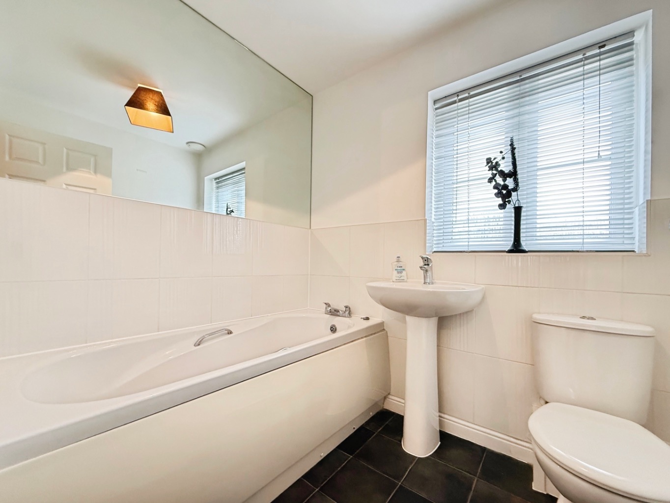 Fitted with a white three piece suite comprising of W/C, pedestal wash hand basin, panelled bath, partly tiled walls, extractor fan, radiator, uPVC double glazed frosted window to front elevation.