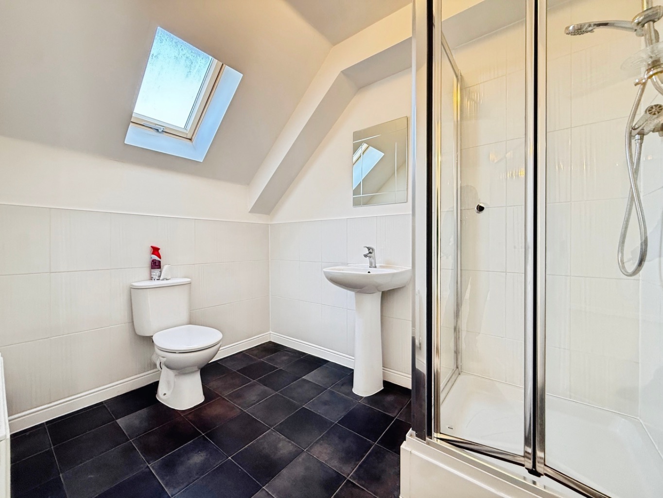 Fitted with a white three piece suite comprising of W/C, pedestal wash hand basin, corner shower enclosure, velux window, radiator, extractor fan, cushioned flooring.