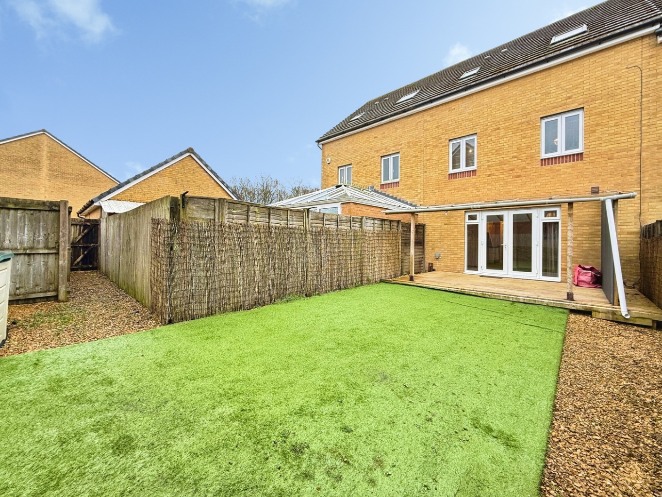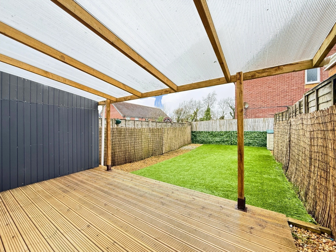 To the rear of the property there is a low maintenance garden with decked area, pergola and artificial lawn with gated side access.