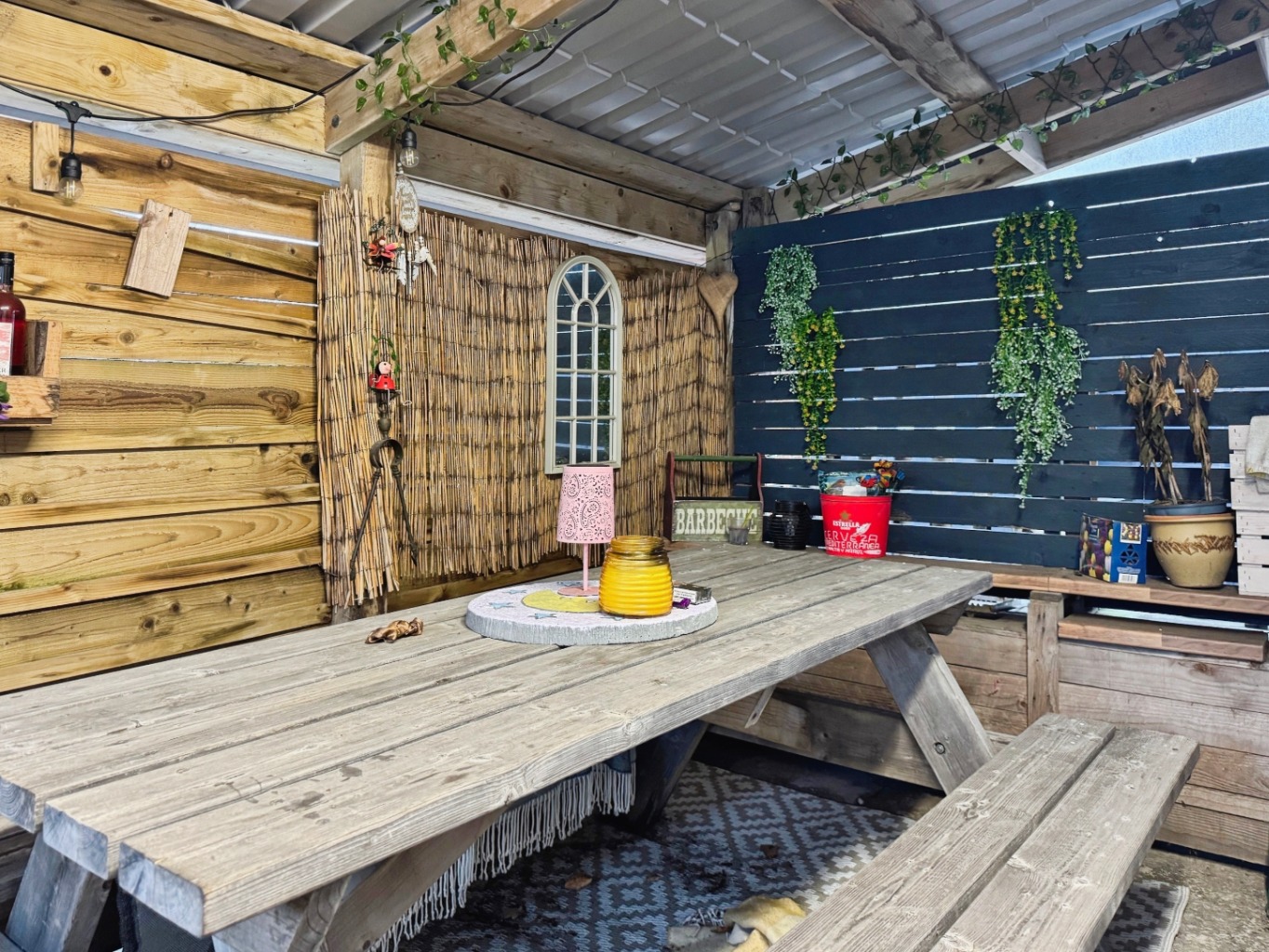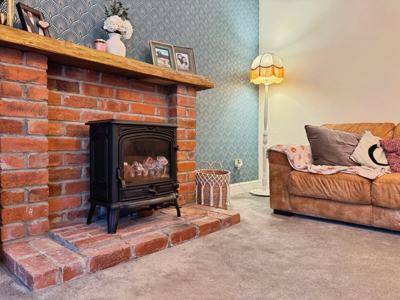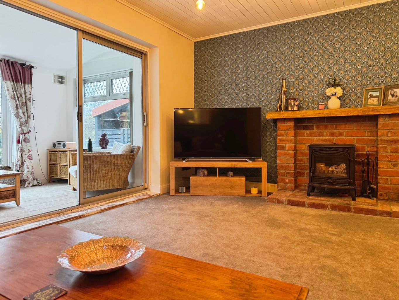 Tongue and groove to ceiling, radiator, decorative wooden window, multi fuel burning stove with brick surround and hearth and wooden mantle piece, aluminium sliding patio doors into: