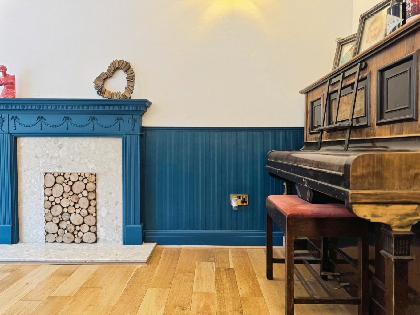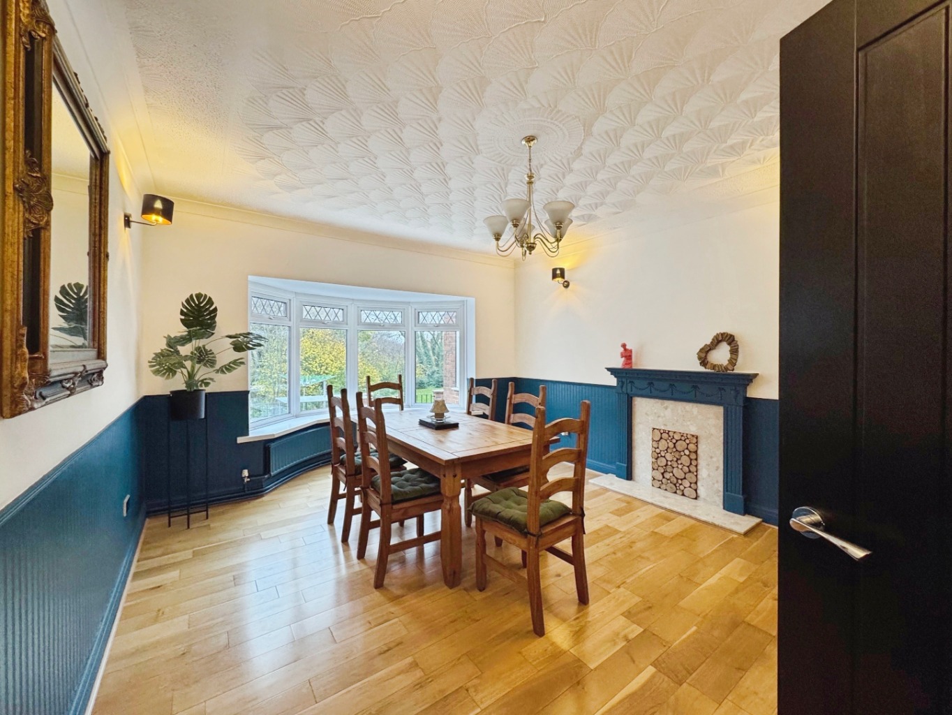 Coving to ceiling, uPVC double glazed bay window, radiator x2, decorative fireplaces part panelled walls, wooden flooring.