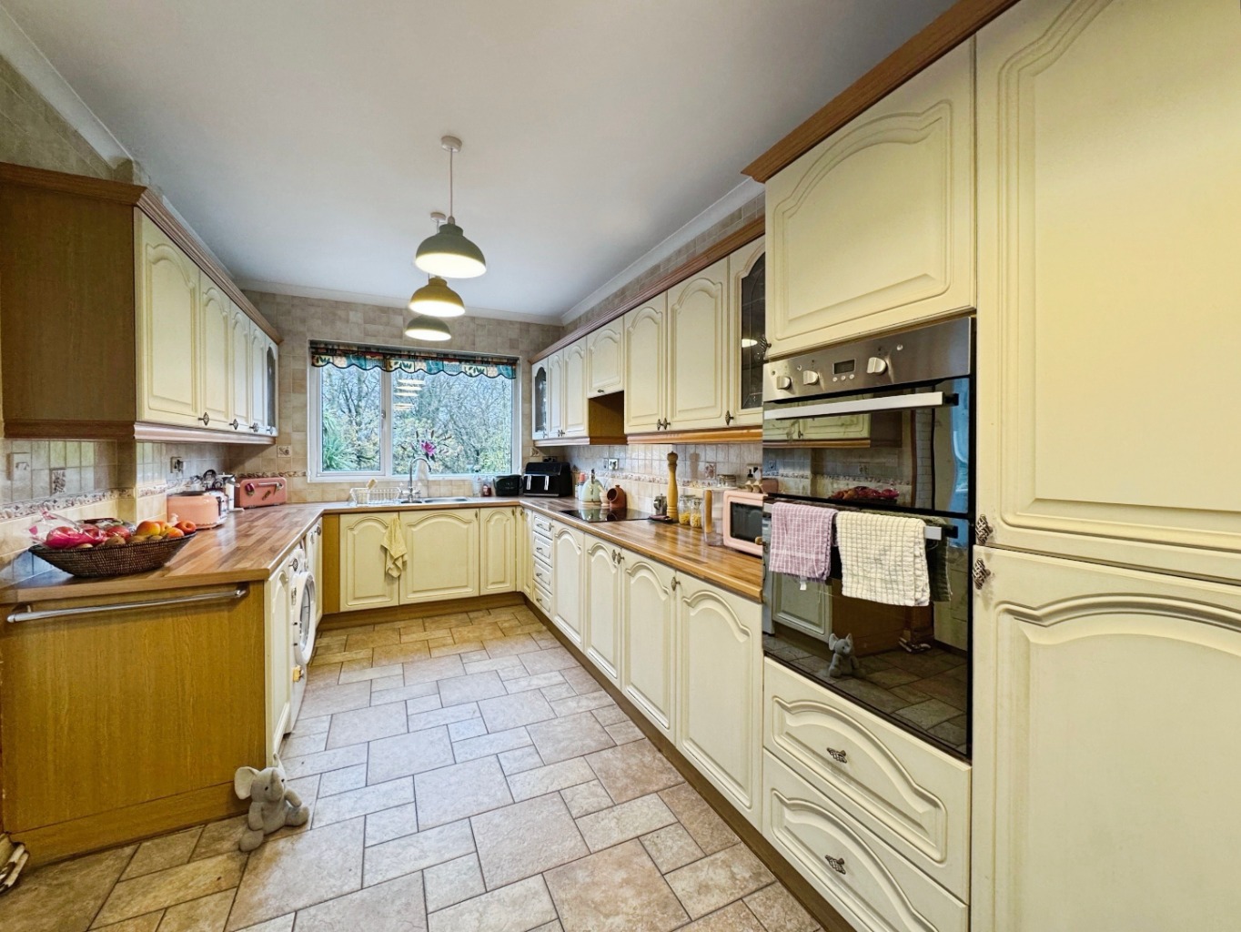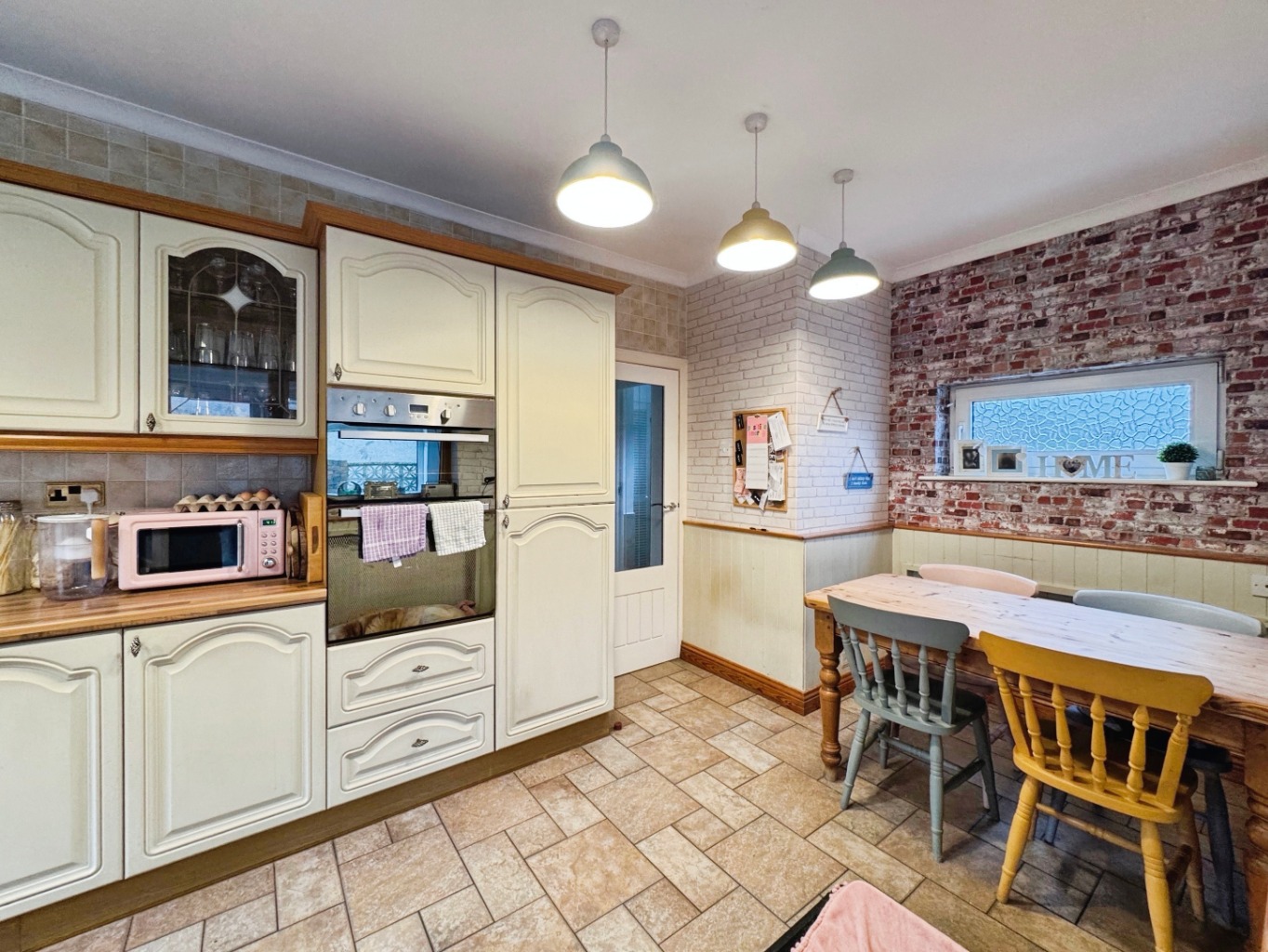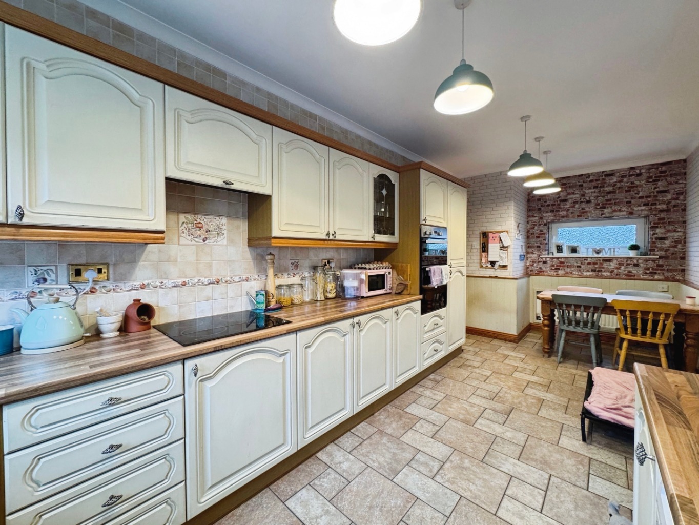 Fitted with a range of matching wall and base units with work surface over; four ring induction hob with extractor fan over, eye level oven and grill, integrated fridge/freezer, plumbing for washing machine, stainless steel 1 and 1/2 bowl sink with drainer and mixer tap, tiled floor, tiled splash back, coving to ceiling, radiator x2, uPVC double glazed window x2, obscure uPVC double glazed window, part panelled walls, wooden glazed door to: