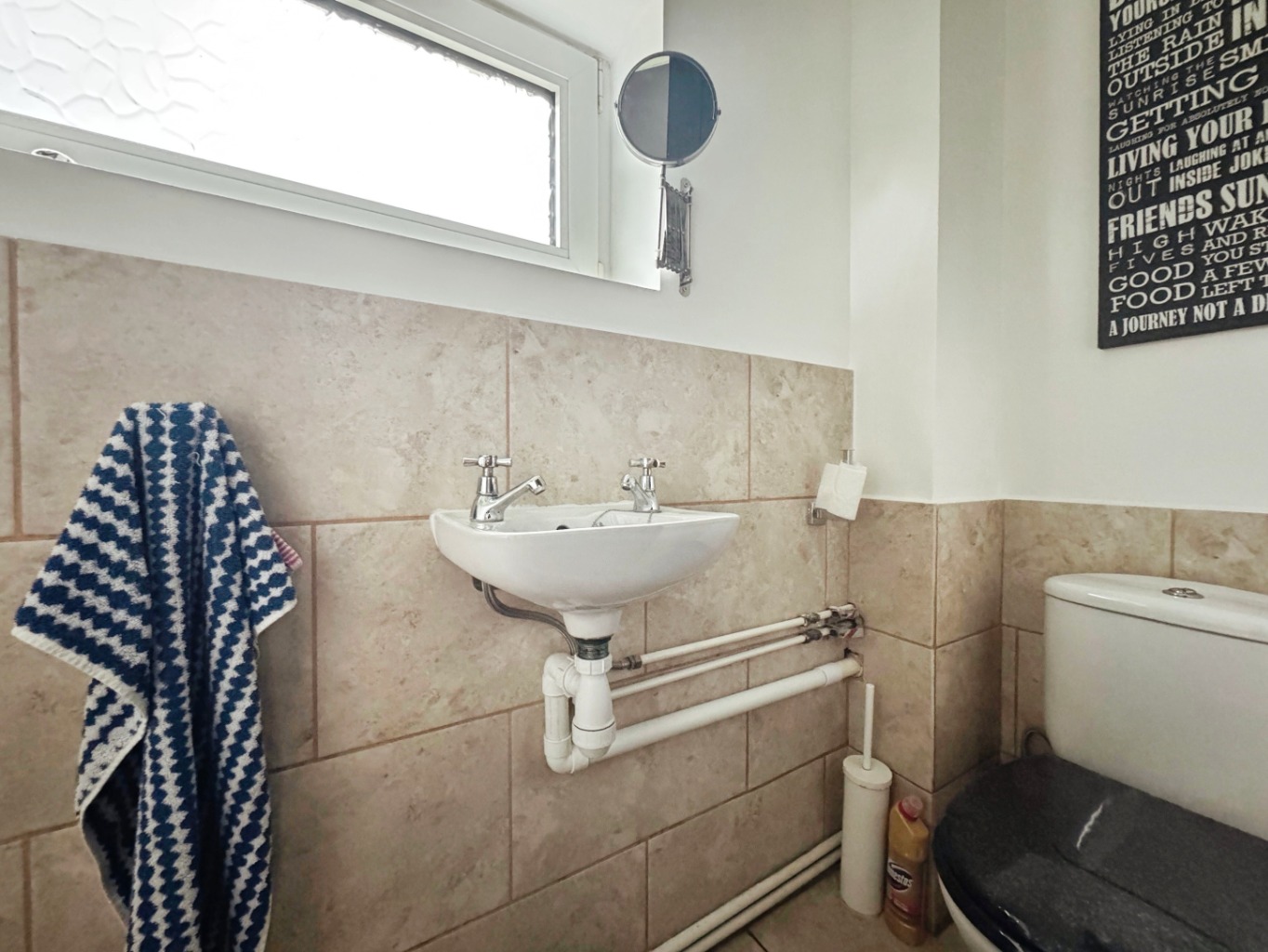 Obscure uPVC double glazed window, W.C wash hand basin, tiled floor, part tiled walls, door to storage cupboard.