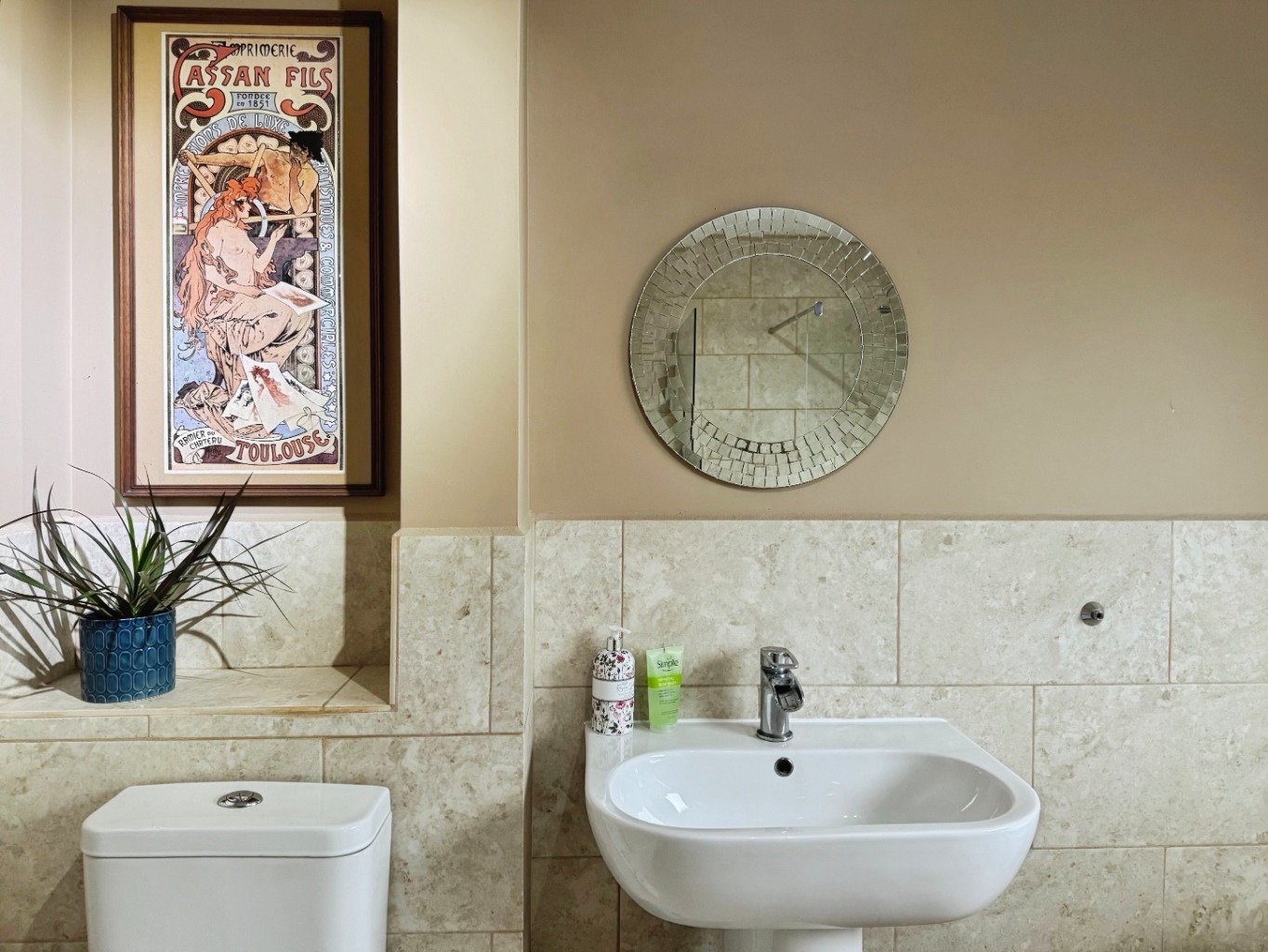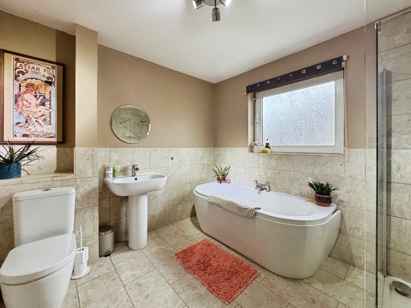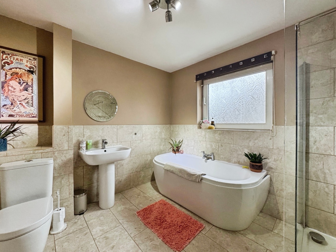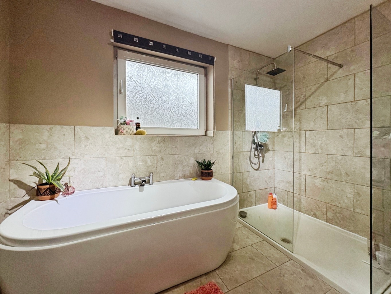 Fitted with a four piece suite comprising of bath, walk in double rainwater shower, w.c and wash hand basin, tiled floor, part tiled walls, obscure uPVC double glazed window, chrome heated towel warmer.