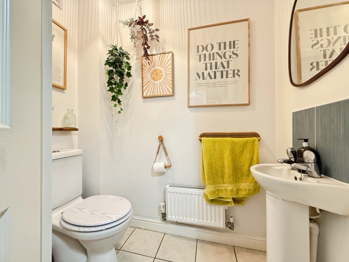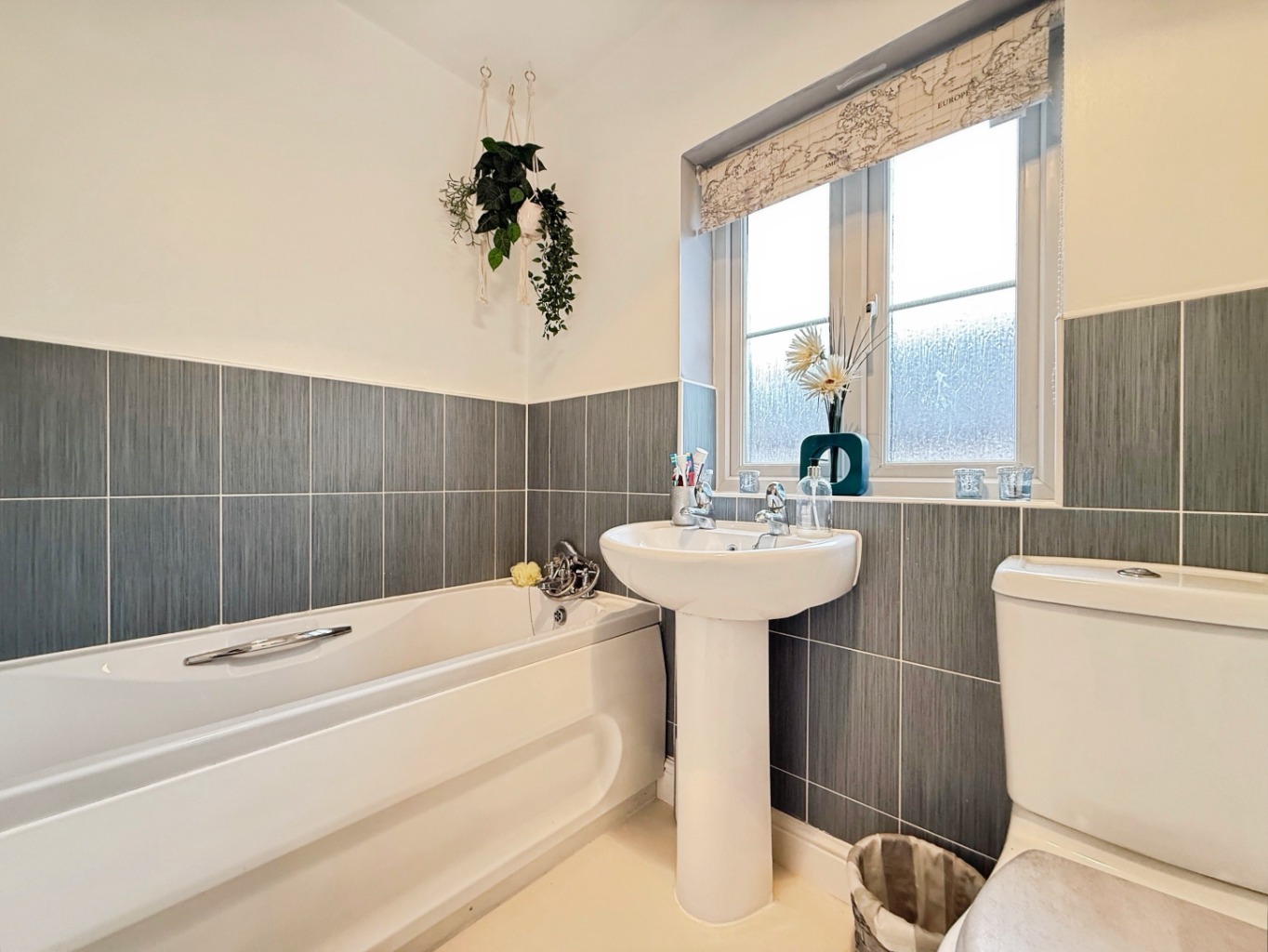 Fitted with a white three piece suite comprising of W/C, pedestal wash hand basin, paneled bath, extractor fan, radiator, uPVC double glazed frosted window to front elevation.