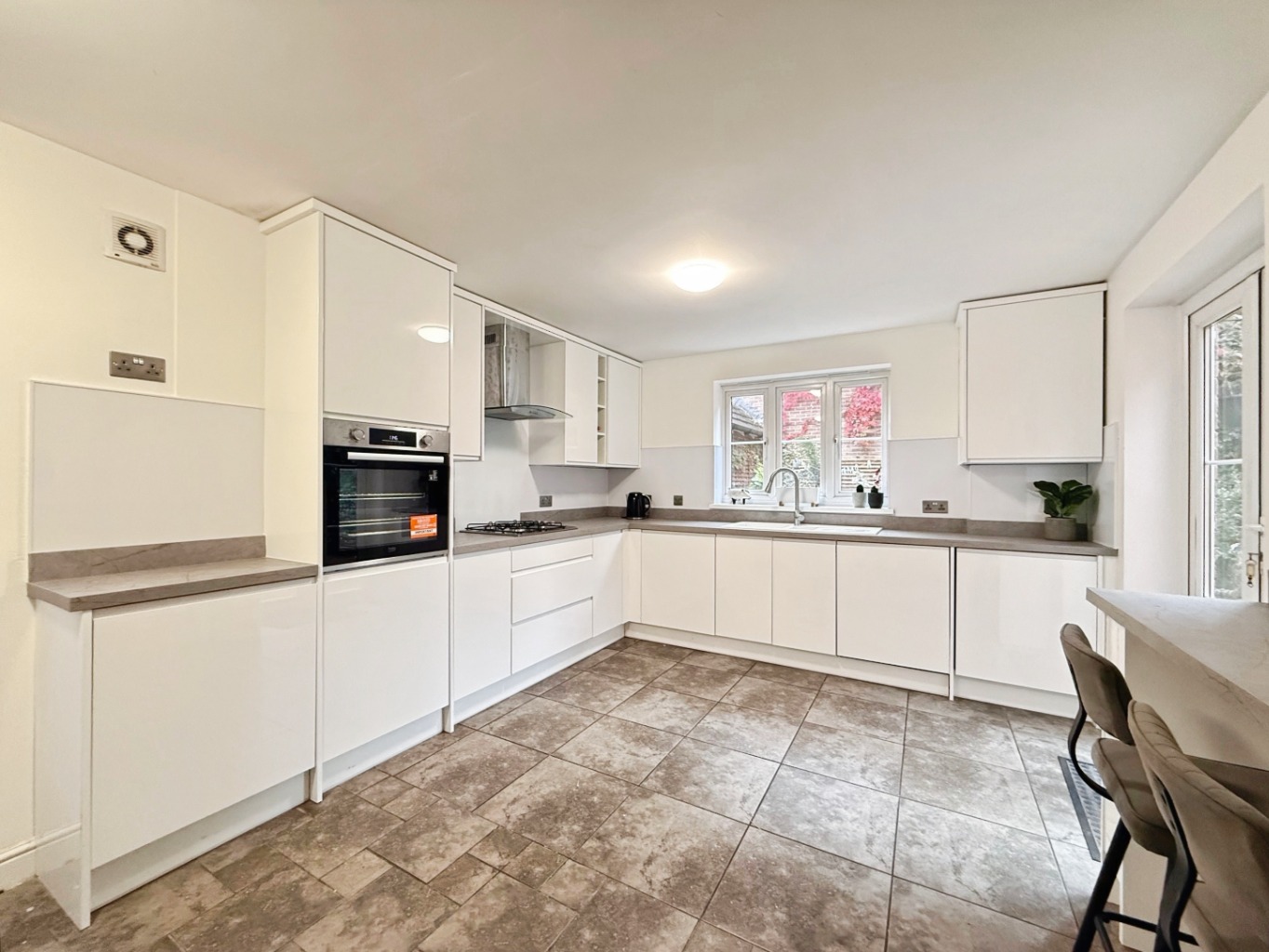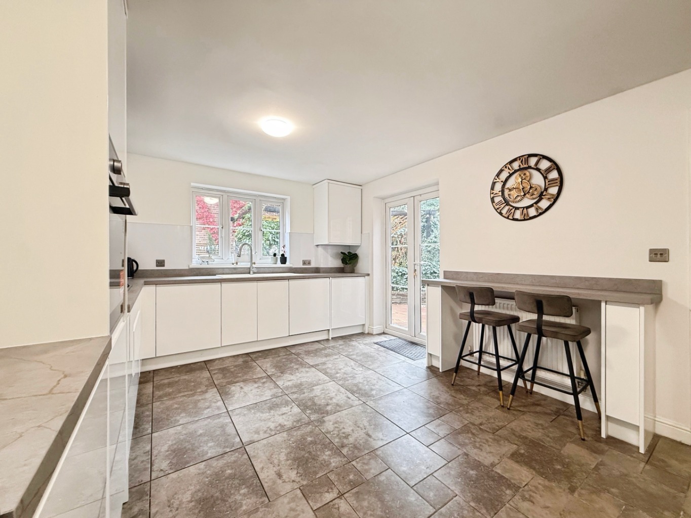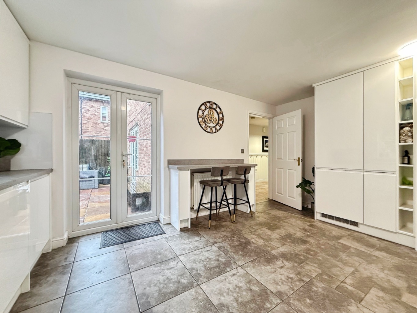 Fitted with a new range of modern wall and base units in white handleless high gloss with complimentary work surface over, white 1 1/2 bowl sink with mixer tap, integrated eye level oven, integrated gas hob with extractor over, integrated dishwasher, integrated washing machine, wall mounted gas combination boiler, integrated fridge/freezer, breakfast bar, radiator, uPVC double glazed window to rear elevation, uPVC double glazed patio doors to garden, side door to driveway.
