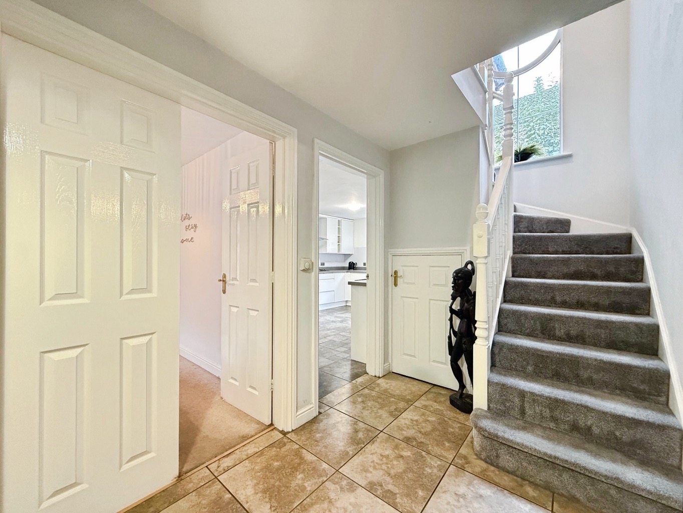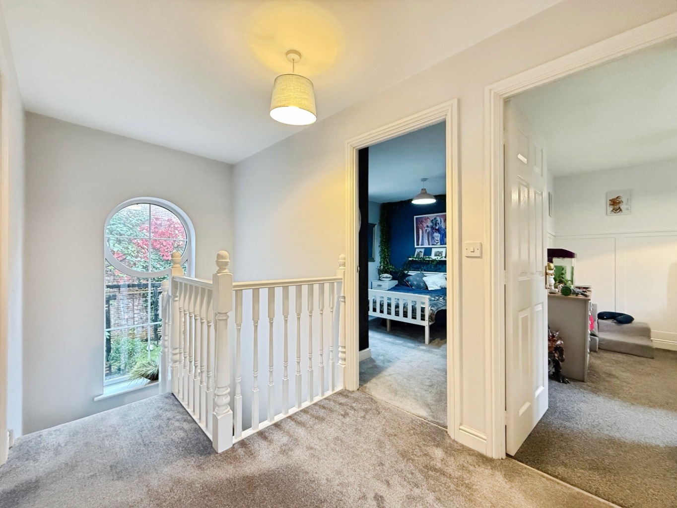 Upstairs, the spacious landing boasts a stunning feature oval window, filling the space with natural light.