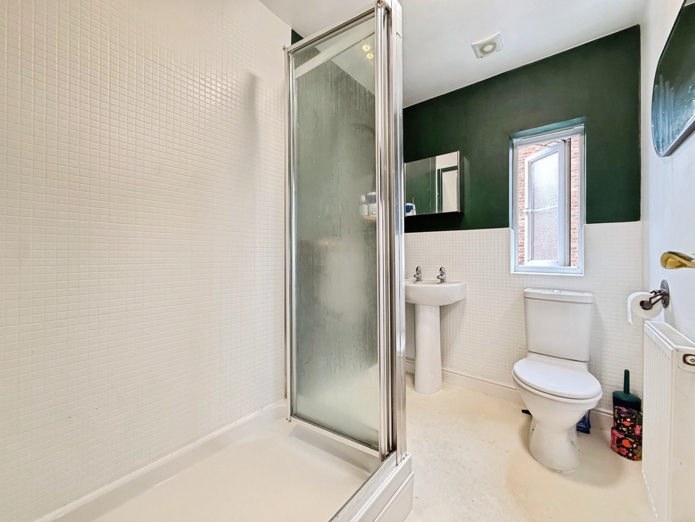 Fitted with a white three piece suite comprising of W/C, pedestal wash hand basin, shower cubicle with glass modesty screen, extractor fan, partly tiled walls, radiator, uPVC double glazed frosted window to side elevation.