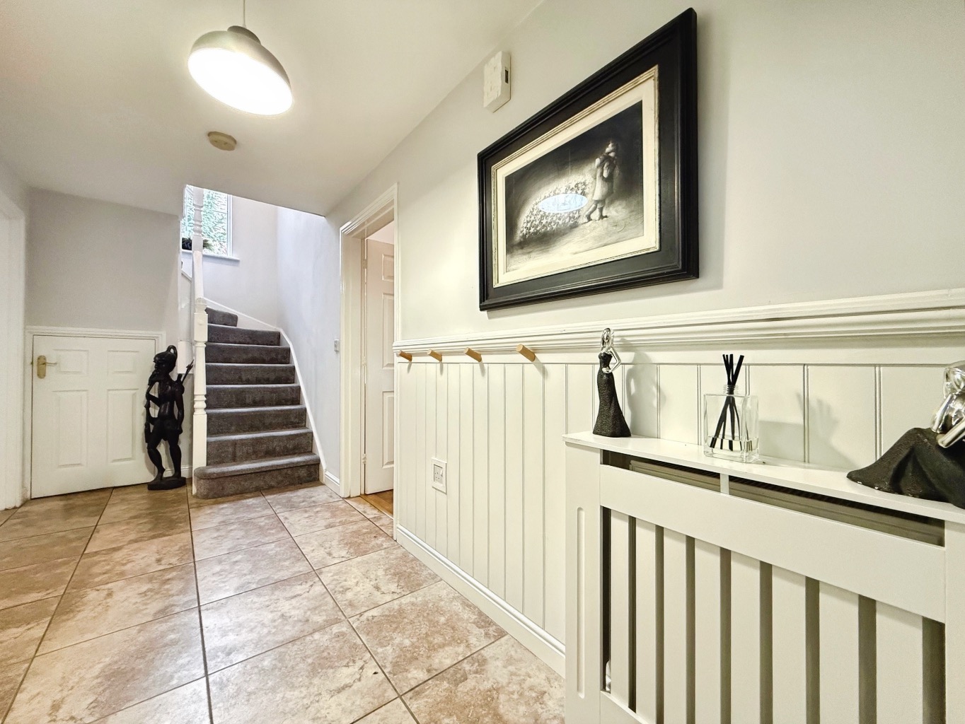 Tiled underfoot, radiator, under stairs storage cupboard, radiator, stairs to first floor, doors into: