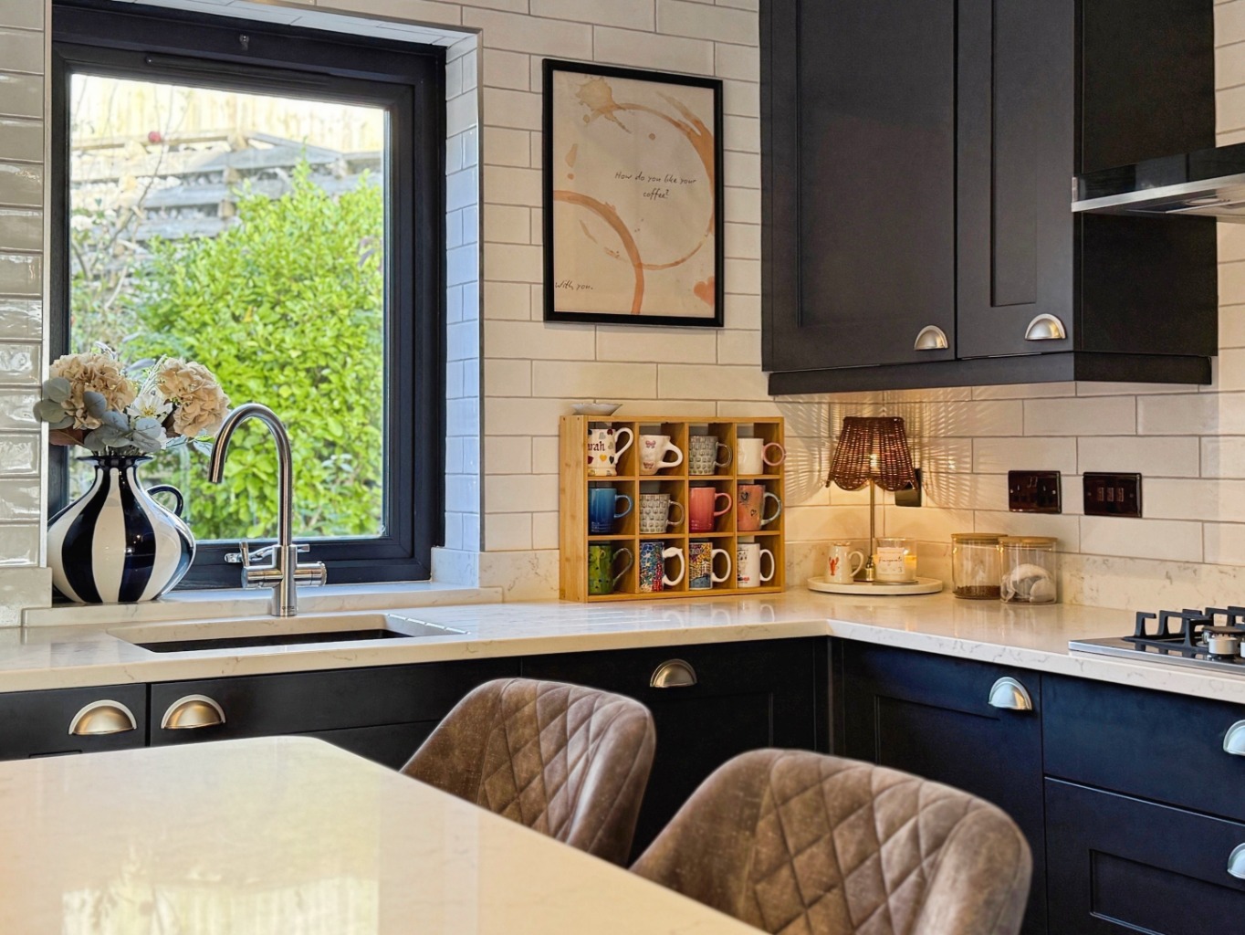 Fitted with a recently upgraded, ultra modern kitchen featuring a range of shaker style matching wall and base units in anthracite grey with complimentary ‘quartz’ work surfaces over, inset sink with drainer grooves and instant hot water tap, five ring gas hob with extractor over, integrated eye level oven and integrated microwave, integrated dishwasher, space for American style fridge/freezer, matching units to centre island, quartz overhang for breakfast bar seating, tiled flooring, radiator, uPVC double glazed window in anthracite grey, triple panel bi-folding doors in anthracite grey to rear elevation.
