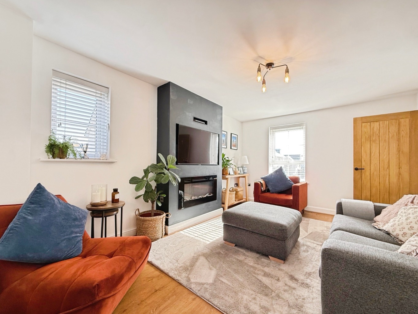 Carpeted underfoot, media wall with space for TV & decorative fireplace under c uPVC double glazed window to front elevation, uPVC double glazed window to side elevation, radiator, tv point, new/additional opening into kitchen.