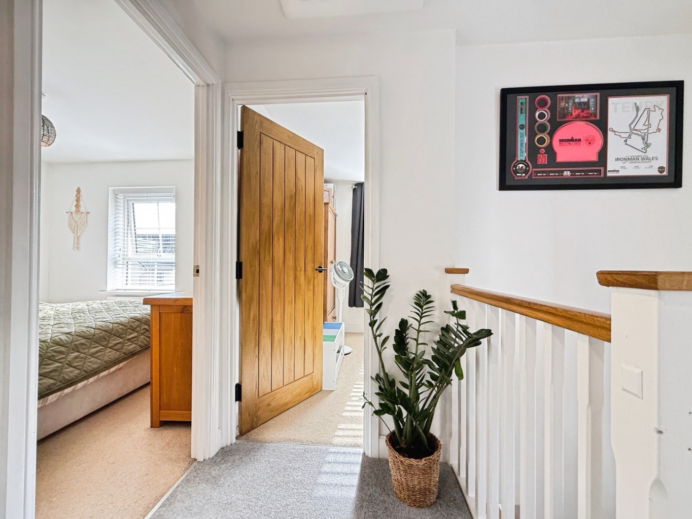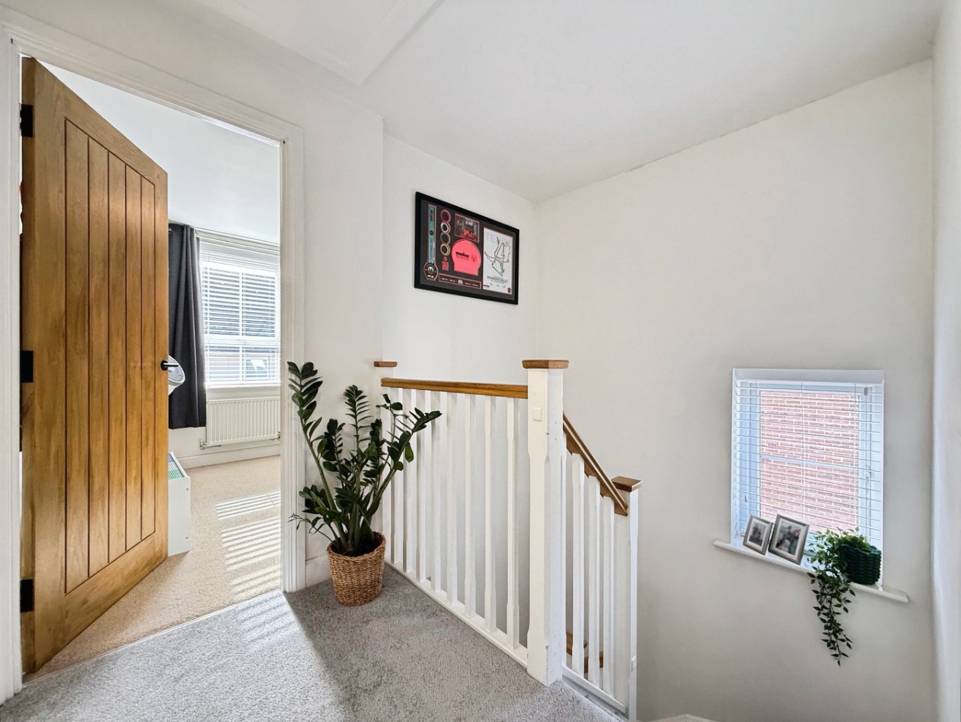 Carpeted underfoot, airing cupboard, uPVC double glazed window to side elevation, radiator, loft access, oak internal doors into: