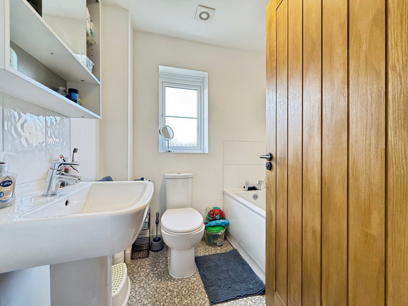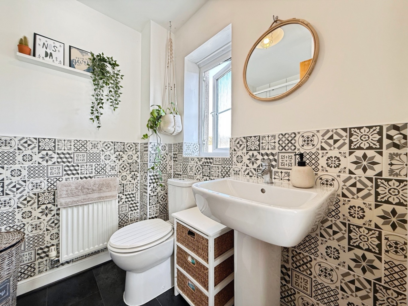 Fitted with a white two piece suite comprising of W/C, pedestal wash hand basin with tiled splashback, radiator, uPVC double glazed frosted window to side elevation.