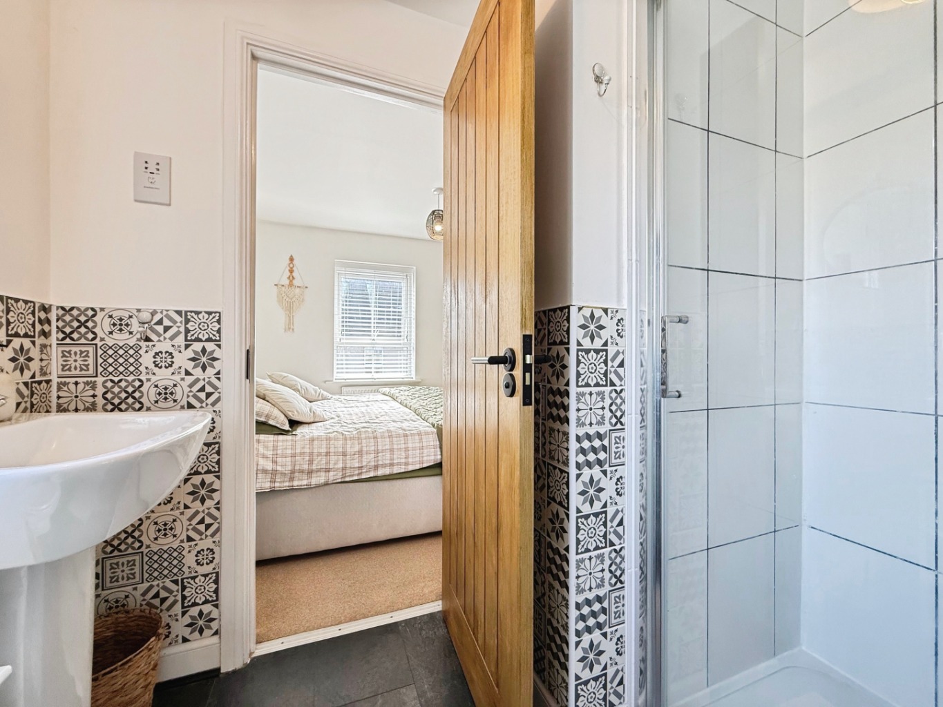 Fitted with a white three piece suite comprising of W/C, pedestal wash hand basin with tiled splashback, walk in double shower cubicle with fully tiled walls and glass modesty screen, radiator, uPVC double glazed frosted window to side elevation.