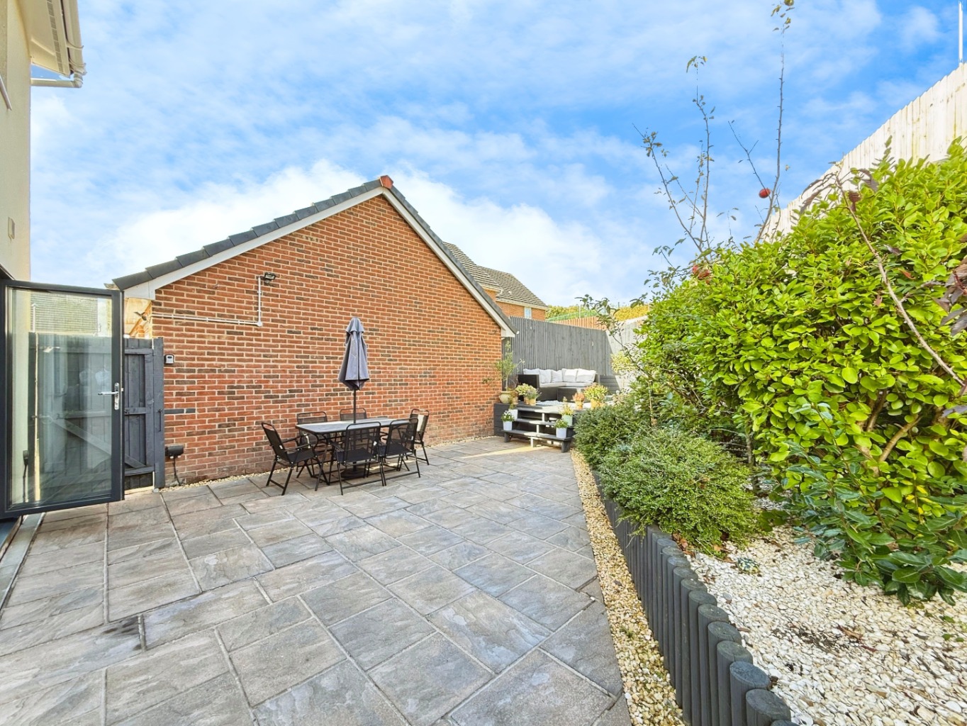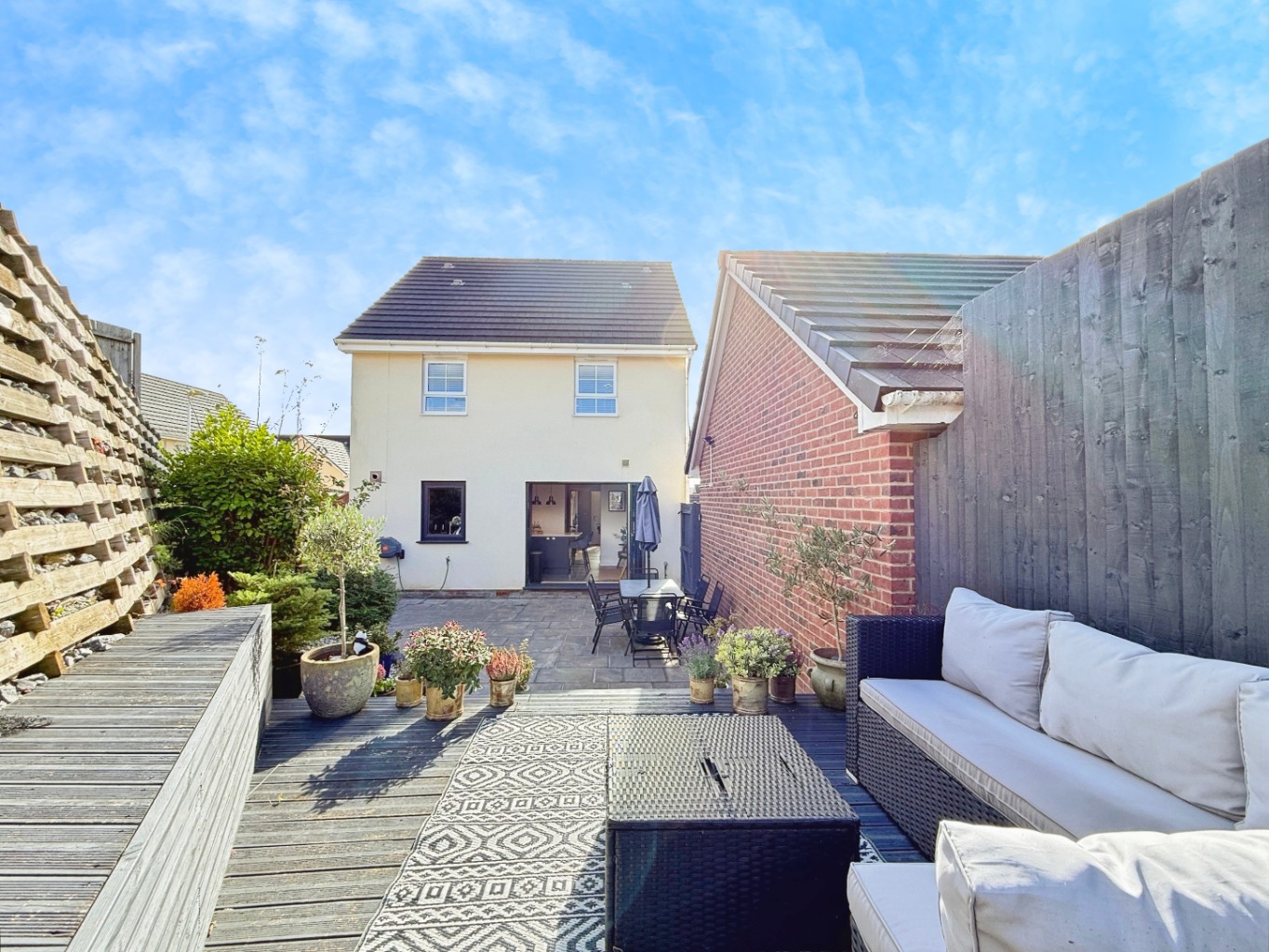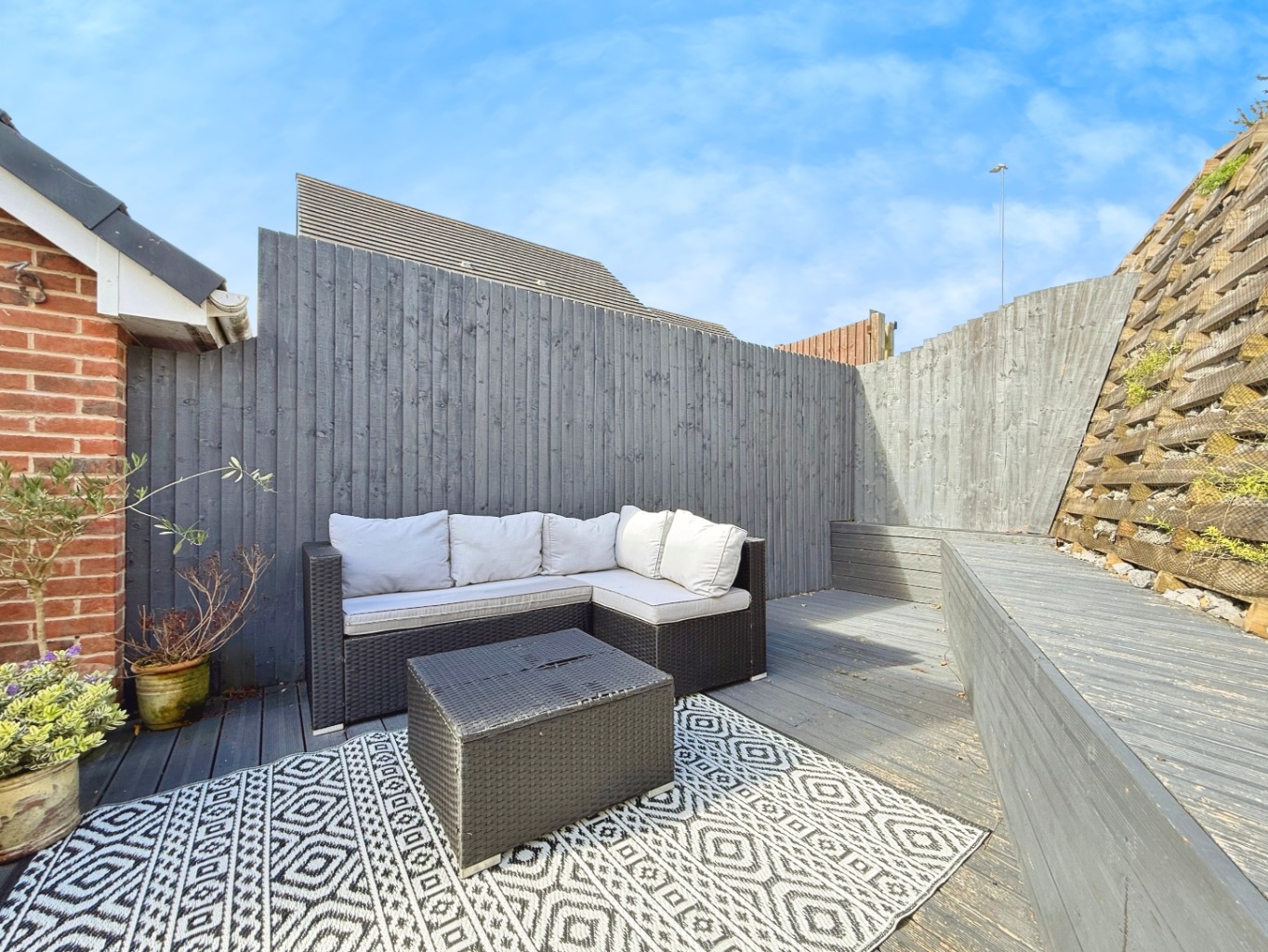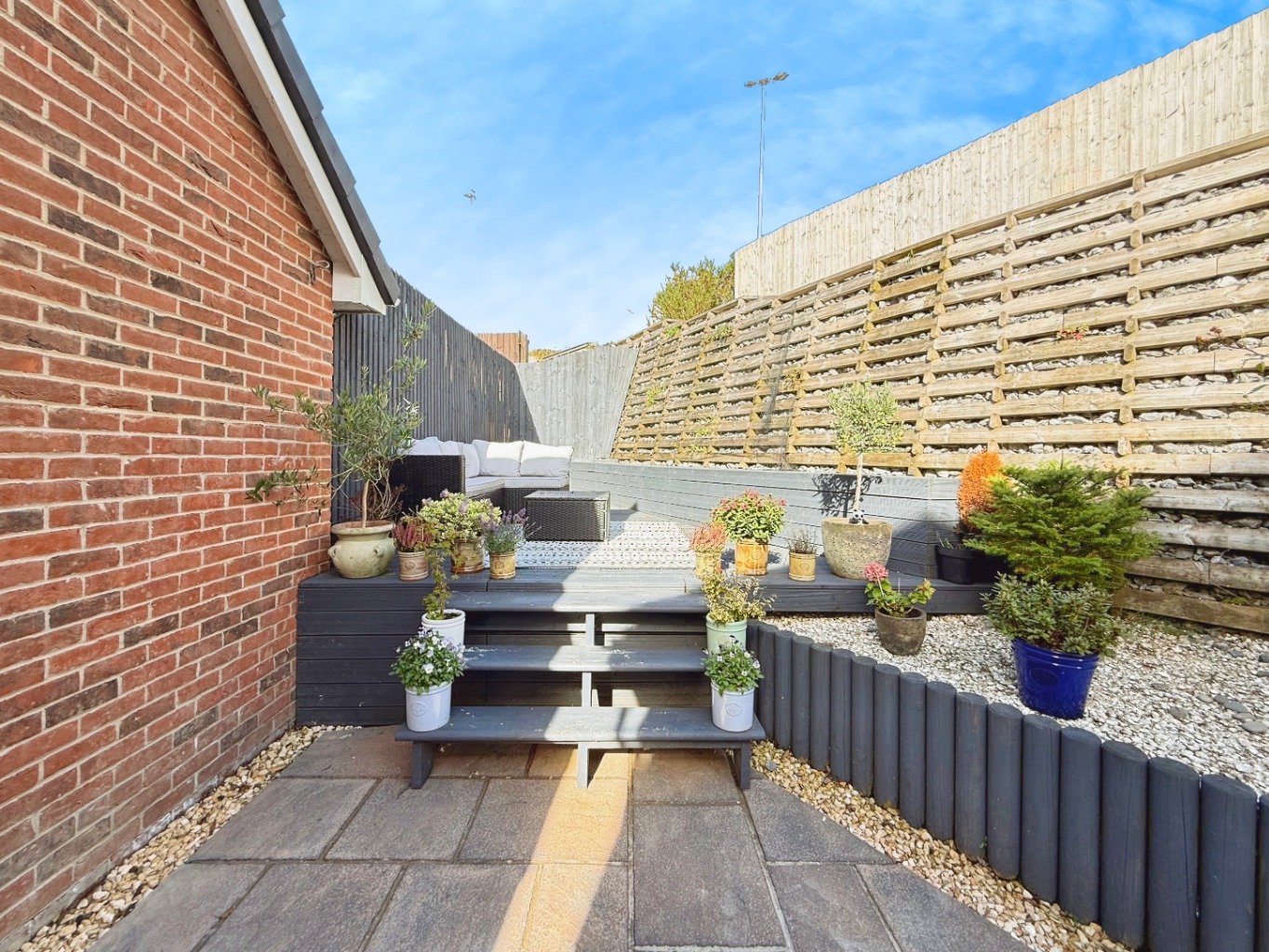 To the rear of the property there is a low maintenance rear garden laid to patio, steps up to a sun deck area, featuring secure fenced boundary. There is gated side access to the driveway.