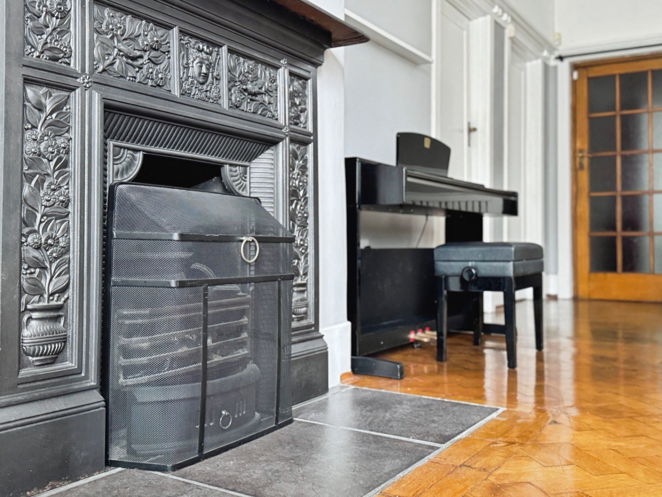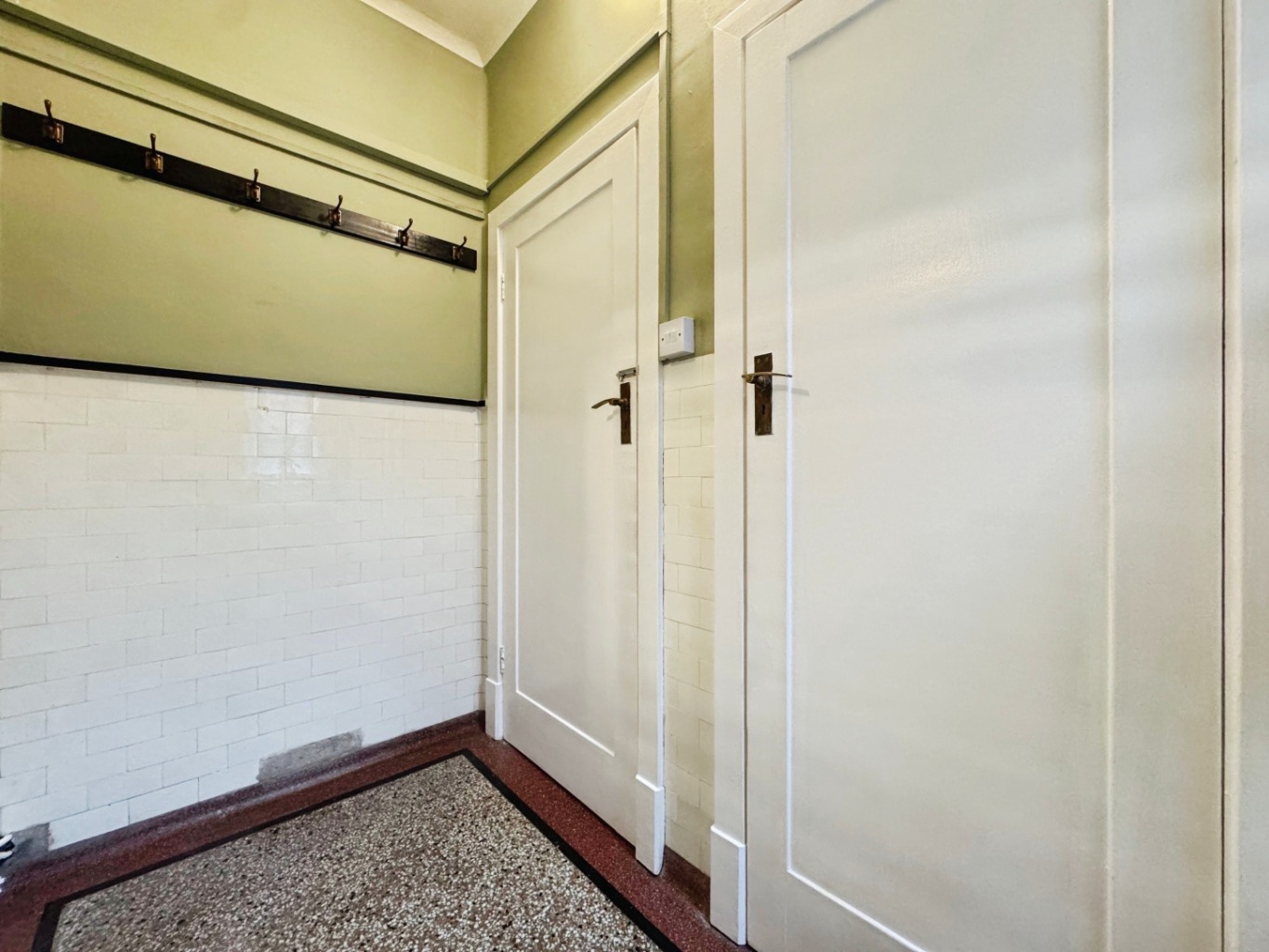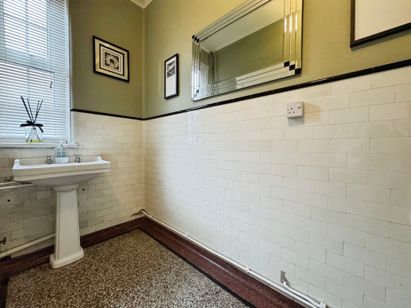 High ceilings create an immediate sense of grandeur, while the original parquet flooring, quarry tiles, and terrazzo floors add warmth and timeless elegance. Delight in the intricate period tiling adorning some walls and even a charming butler's bell, a delightful nod to a bygone era.