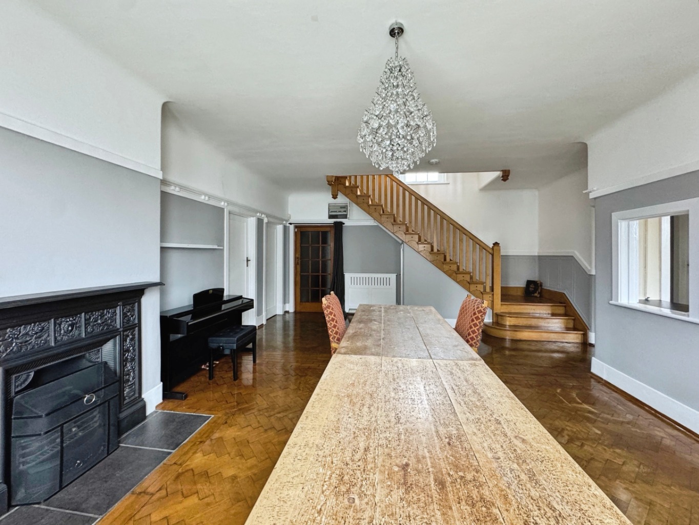Picture rails, uPVC double glazed windows x3, radiator x2, solid wood parquet flooring, stairs to first floor, decorative fireplace, part panelling to staircase, doors to:
