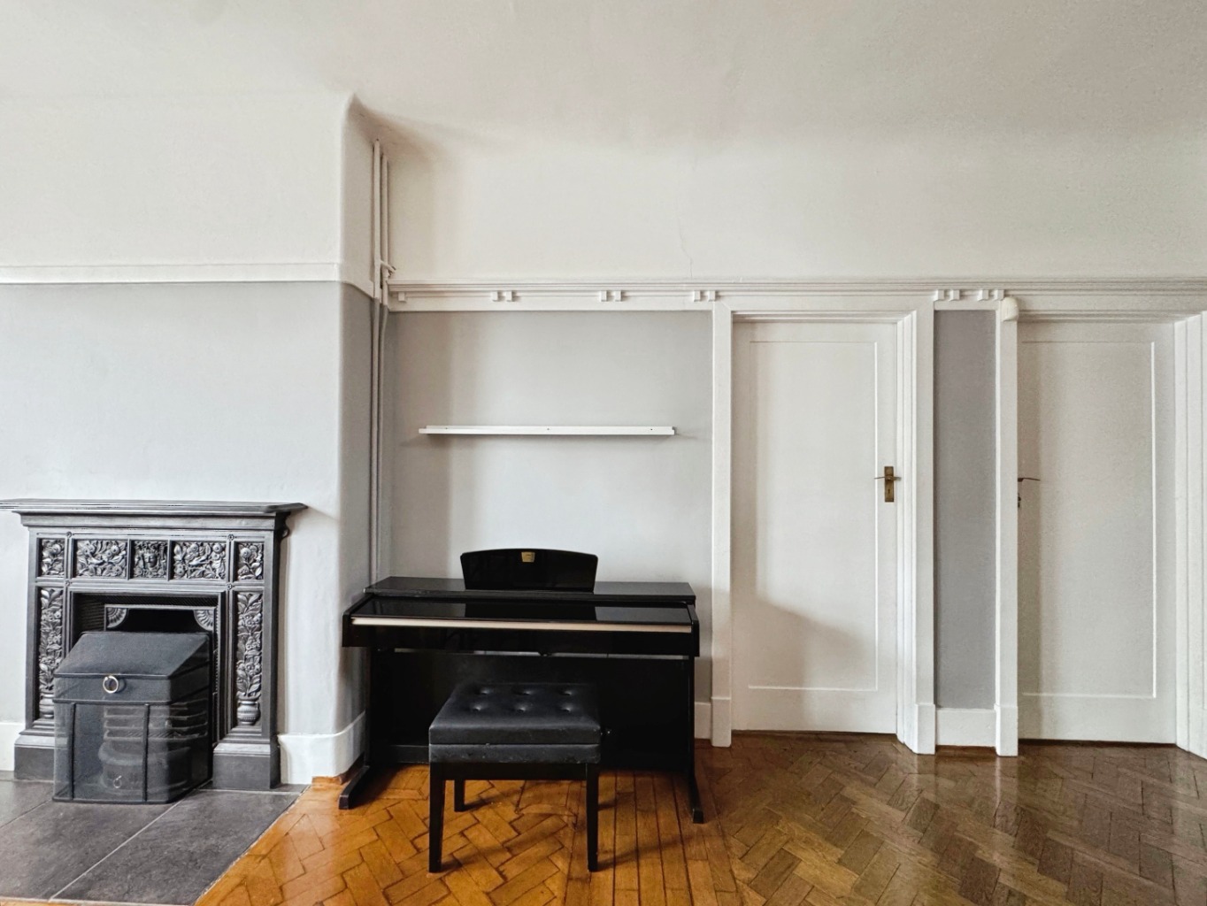 Picture rails, parquet flooring, radiator x2, built in cupboard with shelving.