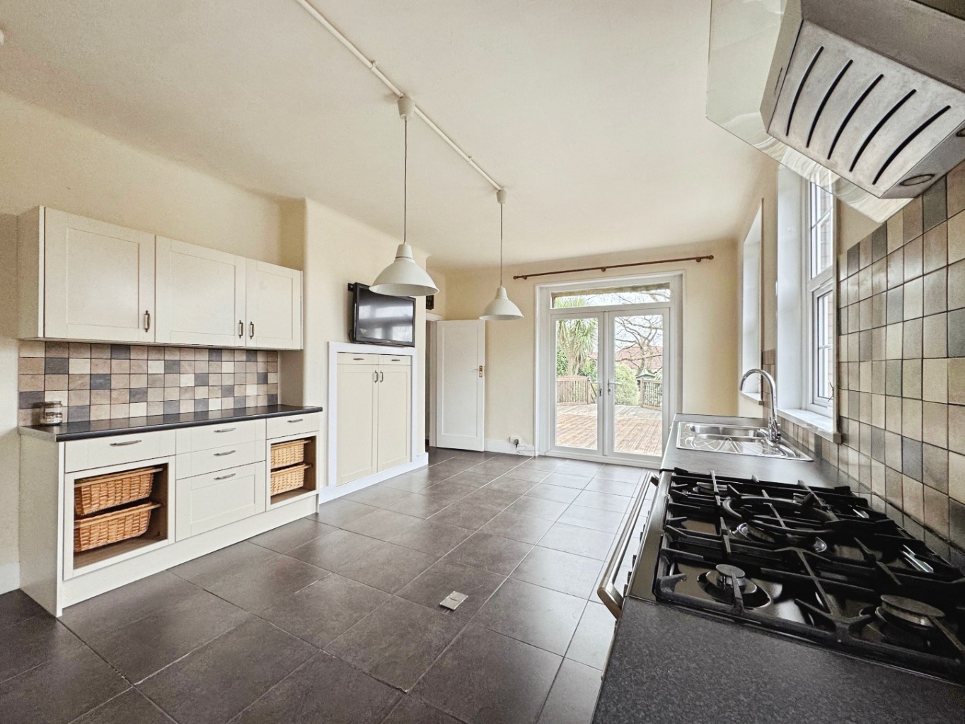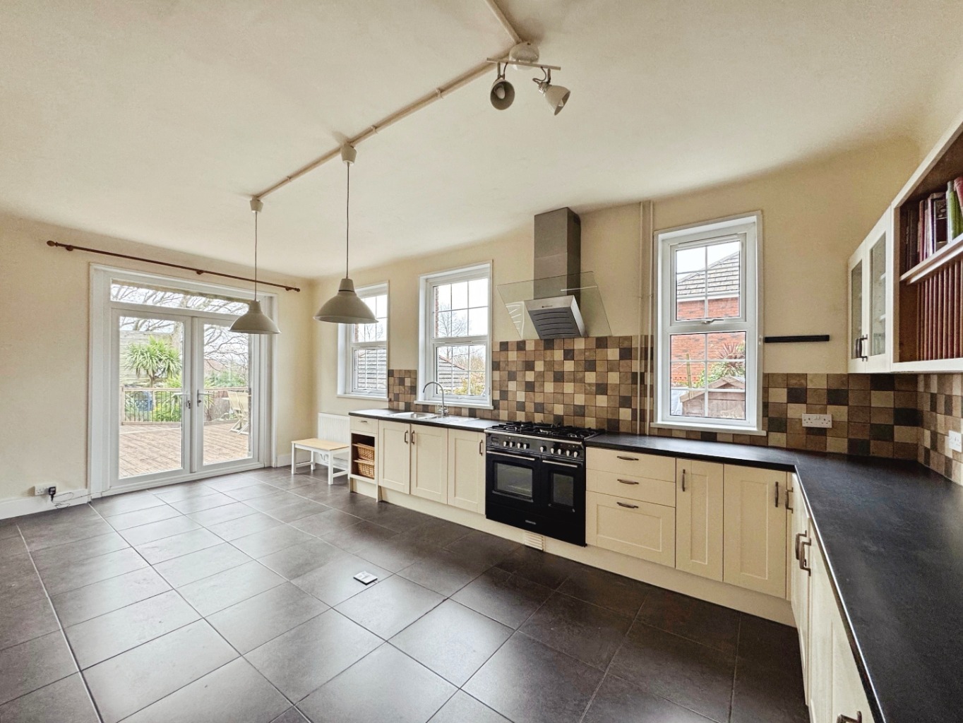 Fitted with a range of matching wall and base units with work surface over, range cooker with extractor fan over, stainless steel sink 1 and 1/2 bowl sink with drainer and mixer tap, cupboard housing gas boiler, tiled floor, uPVC double glazed windows x3, uPVC double glazed french doors, part tiled walls, radiator, door to: