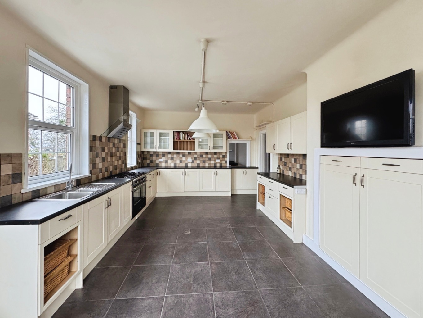 The spacious kitchen and breakfast room is a bright and inviting hub, featuring patio doors that open directly onto the rear garden, blurring the lines between indoor and outdoor living. This culinary haven also provides access to a practical utility room, complete with a ceiling airer, a convenient pantry, a cloakroom, and a log store, ensuring every practical need is met with ease.