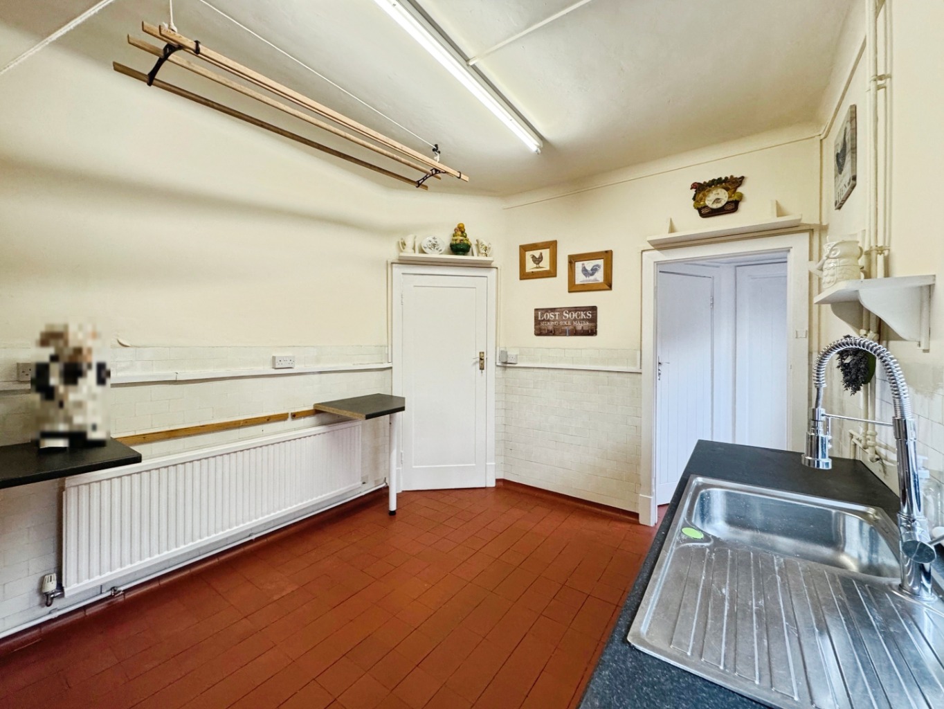 Base unit with with work surface over and stainless steel sink with drainer and pull down tap, plumbing for washing machine, radiator, gas boiler, built in shelving, part tiled walls, uPVC double glazed window, quarry tiled floor, pulley airer, doors to: