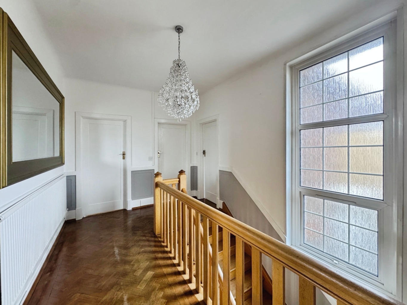 uPVC double glazed window to stairwell, radiator, part panelled walls, parquet flooring, access to loft with pull down ladder which has been boarded with lighting, door to airing cupboard with shelving and water tank, doors to: