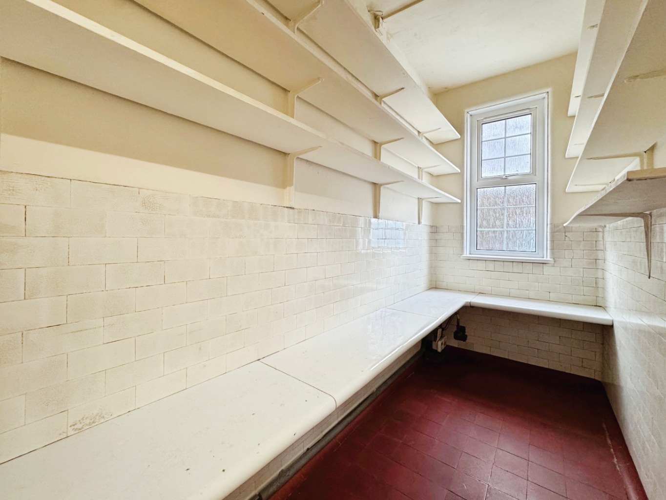 Part tiled walls, built in shelving, quarry tiled floor, obscure uPVC double glazed window.