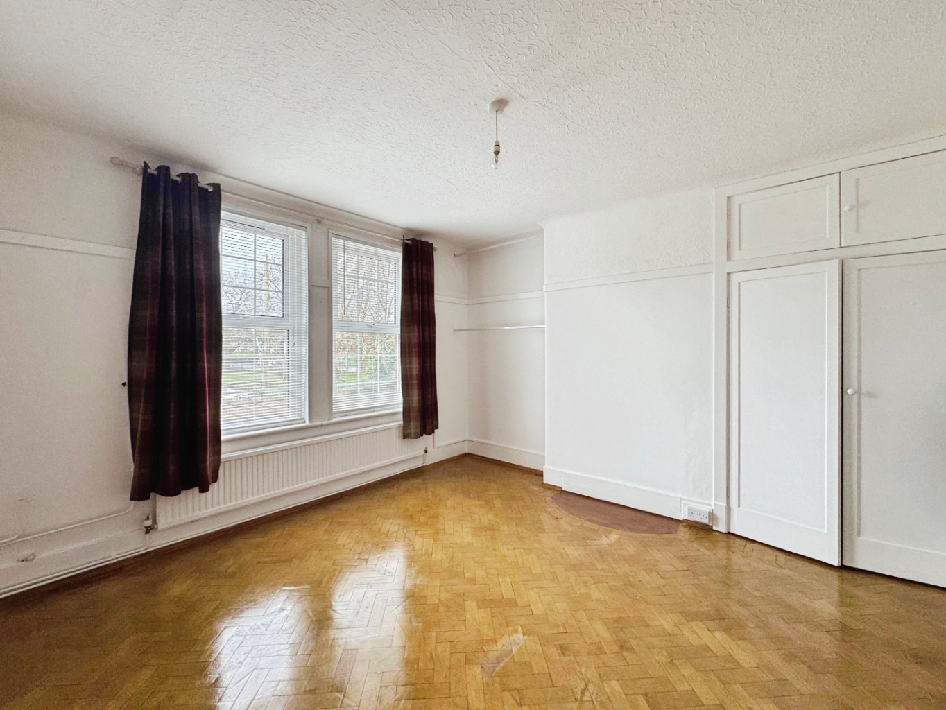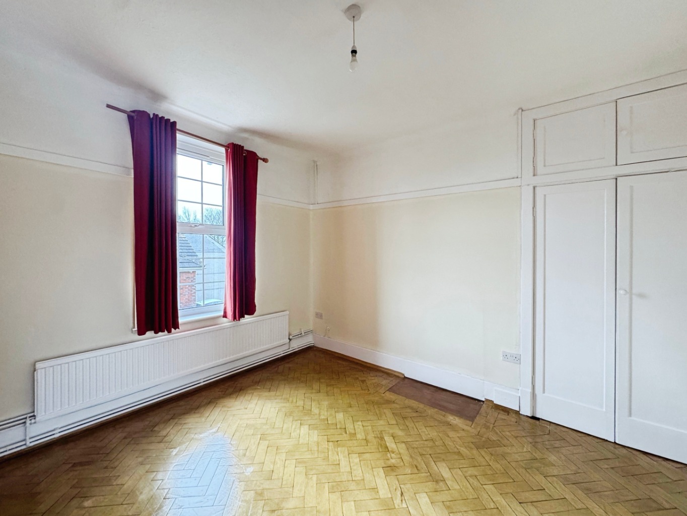 Picture rails, uPVC double glazed window x3, radiator x2, parquet flooring, cupboard with built in shelving.